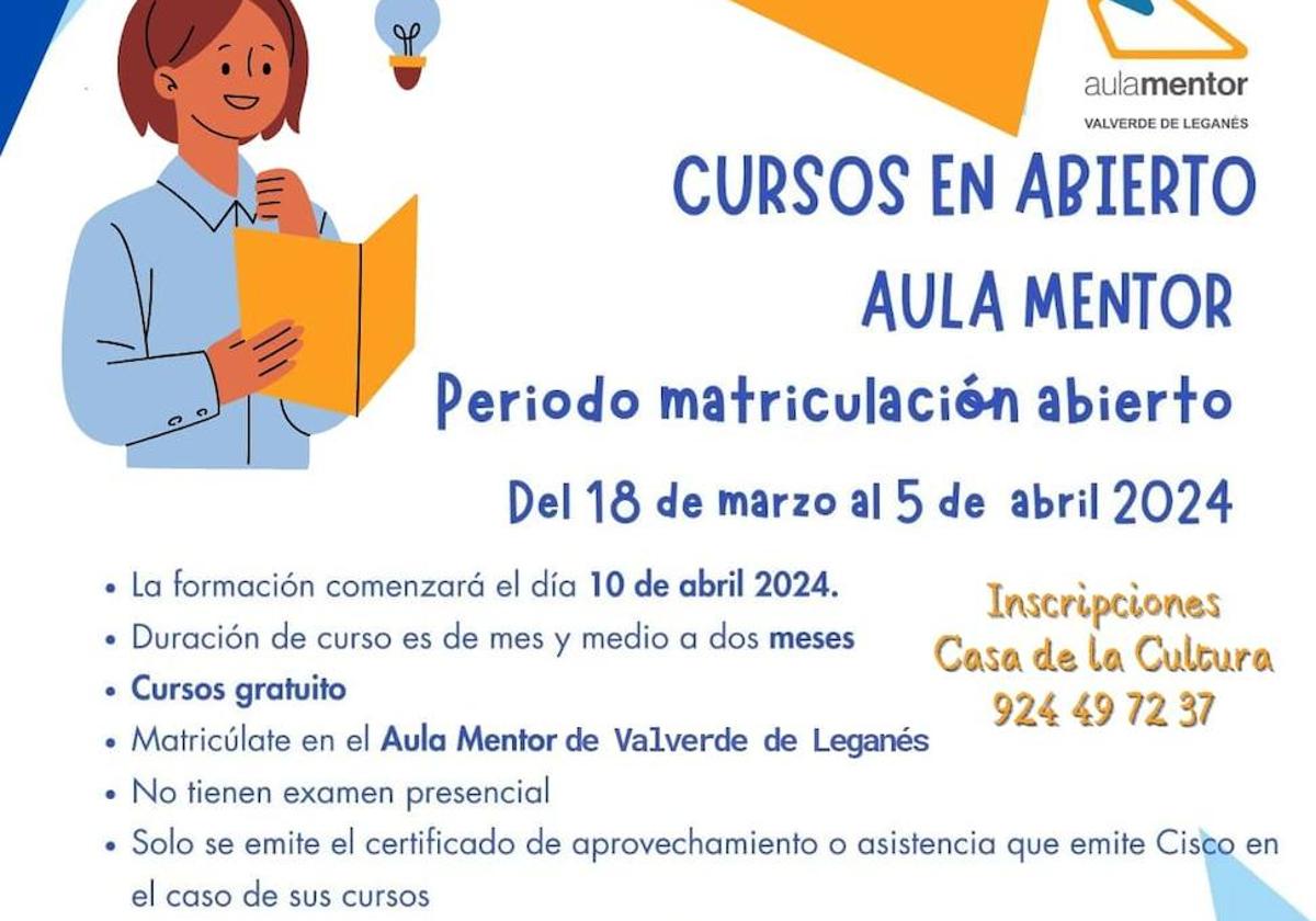 Estas inscripciones pueden realizarse de forma gratuita por correo electrónico a través de la dirección valverdedeleganes@aulamento.es. En dicho correo hay que indicar el curso a realizar y el plazo finaliza el próximo viernes 5 de abril.