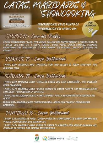 - 13.00 horas: cata de maridaje AREQ: 'queso de cabra de aracena con vino naranja del condado de Huelva'. Por Quesería Monte Robledo. Lugar: Carpa institucional.
