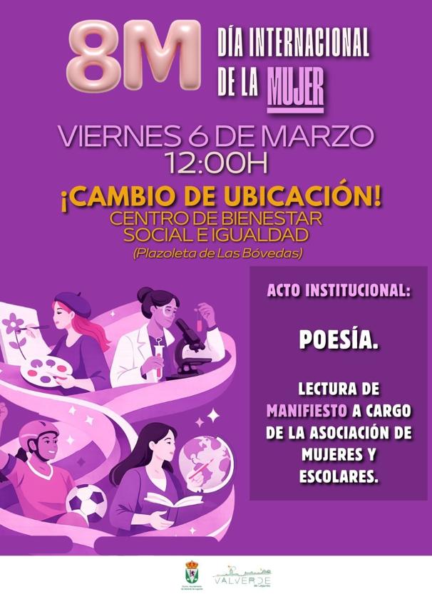 El Ayuntamiento de Valverde de Leganés ha anunciado que el acto institucional principal organizado con motivo del Día Internacional de la Mujer cambiará de ubicación debido a la previsión de lluvias para este viernes 6 de marzo.