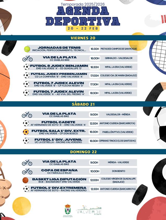 • Fútbol Judex Cadete: el EMD Valverde visita al AF Hernando de Soto, a las 12.30 horas en el campo Antonio Cuerda de Barcarrota.