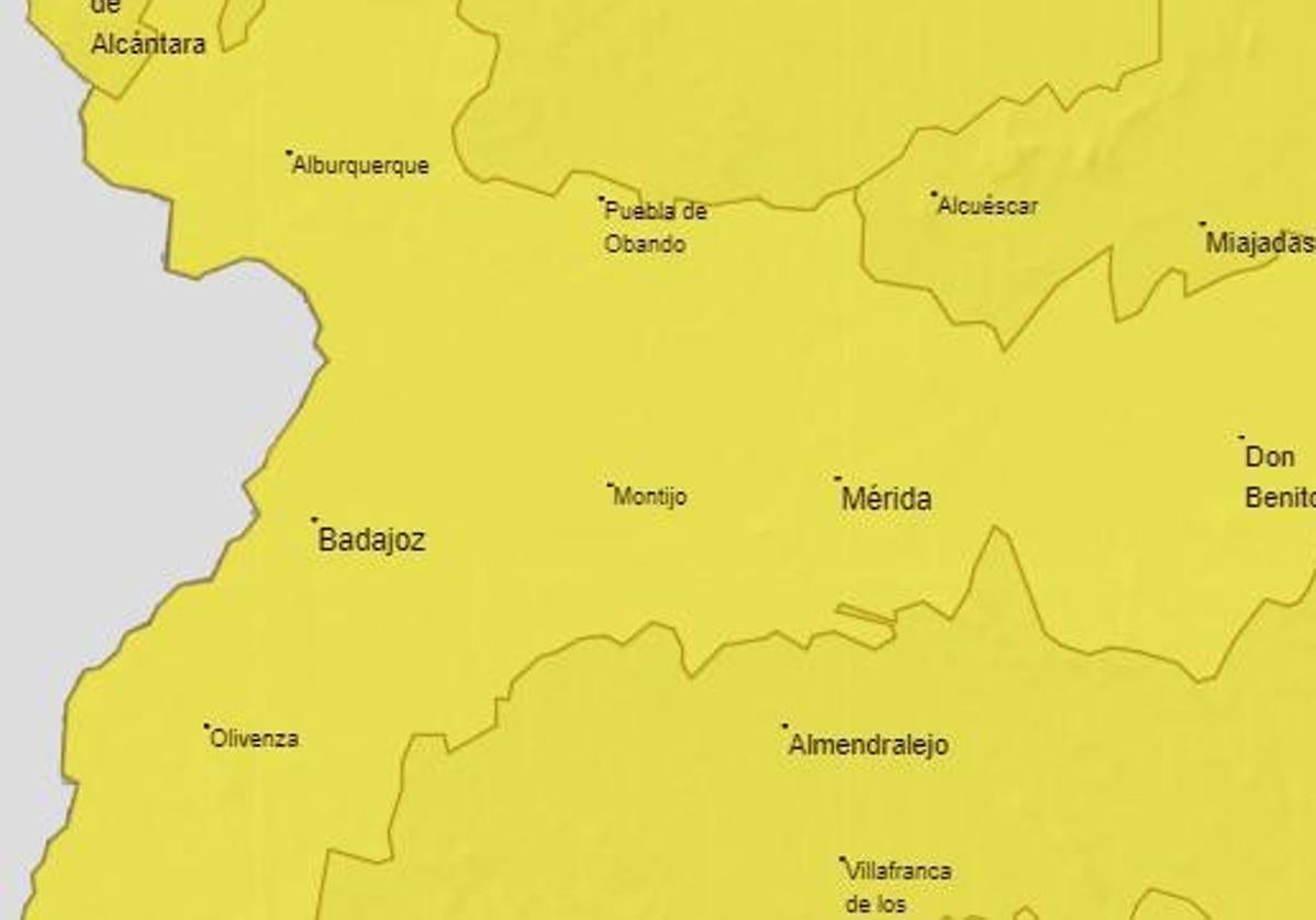 En las Vegas del Guadiana, donde se encuentra Valverde de Leganés, la alerta comienza a las 12.00 horas hasta las 23.59 horas.