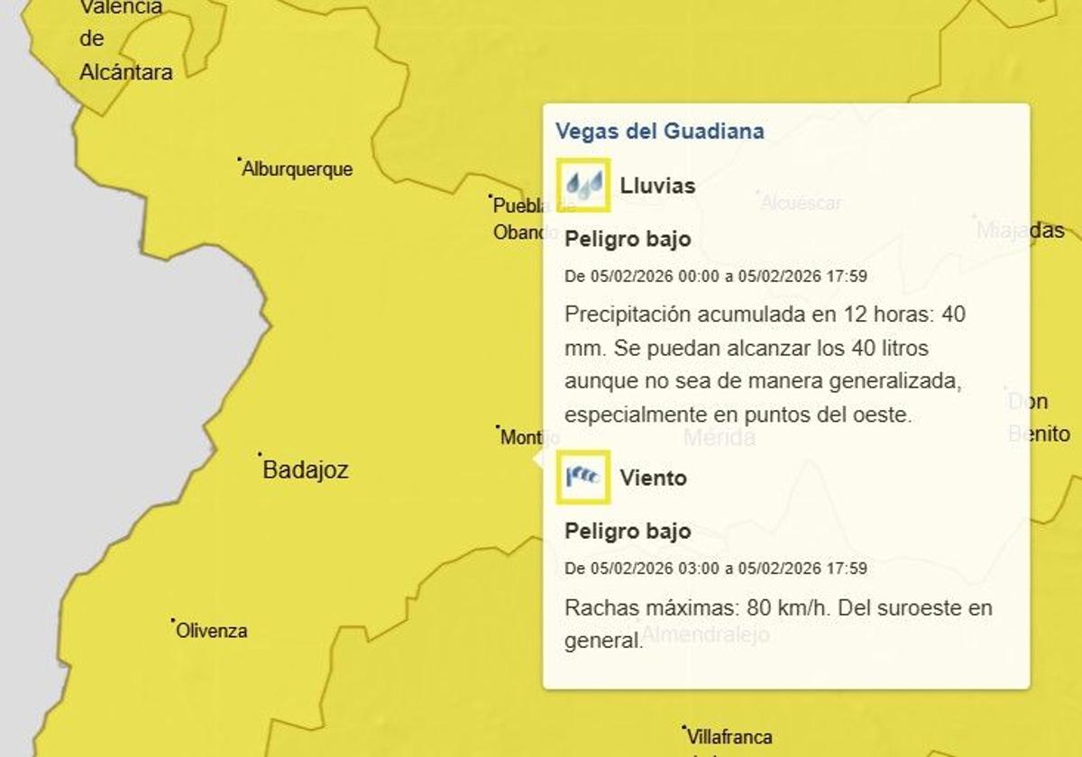 Las Vegas del Guadiana, donde se encuentra Valverde de Leganés, está en alerta amarilla por fenómenos meteorológicos adversos este jueves 5 de febrero. Según la Agencia Estatal de Meteorología (AEMET) y el 112 Extremadura, hay avisos activos por lluvias y viento que podrían durante gran parte del día.