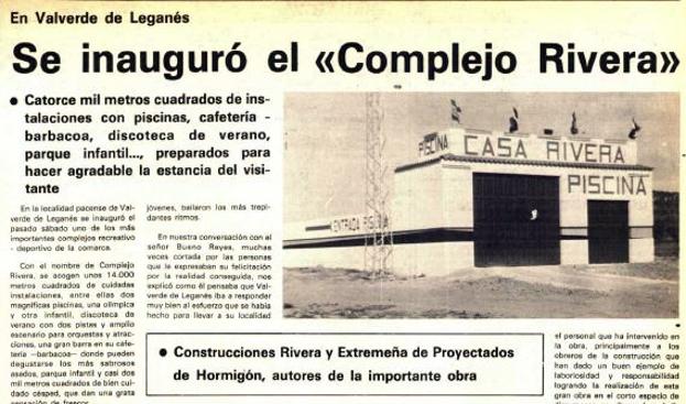 La piscina tiene mucha historia. Se construyó hace casi 40 años y en mayo de 1982 se produjo su inauguración. Concretamente, el 25 de mayo de 1982, el Diario Regional HOY publicaba la información sobre la inauguración del «Complejo Rivera». Dicha inauguración fue el 22 de mayo, sábado, tratándose de uno de los complejos recreativos – deportivos más importantes de la comarca.