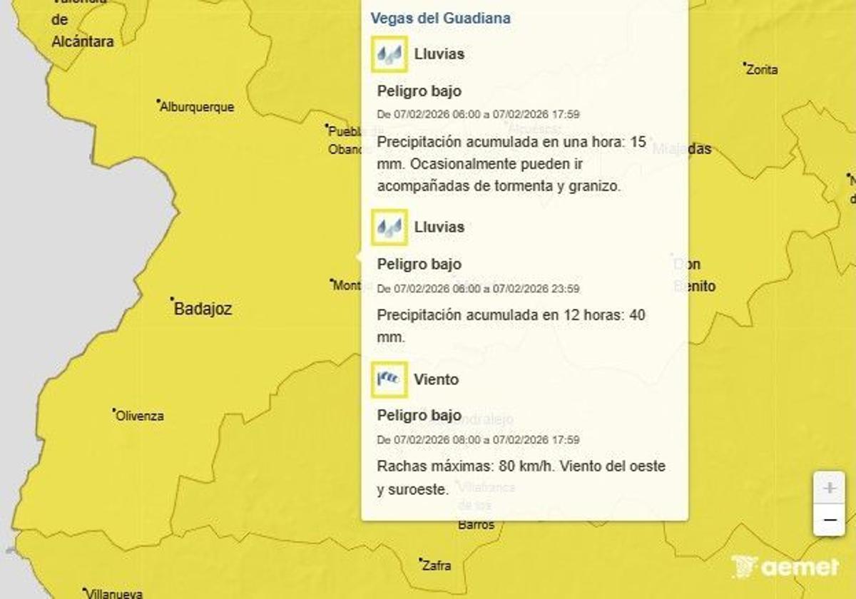 La Agencia Estatal de Meteorología (AEMET) ha activado avisos por lluvias y viento en la comarca de las Vegas del Guadiana, donde se encuentra Valverde de Leganés, para este sábado 7 de febrero.