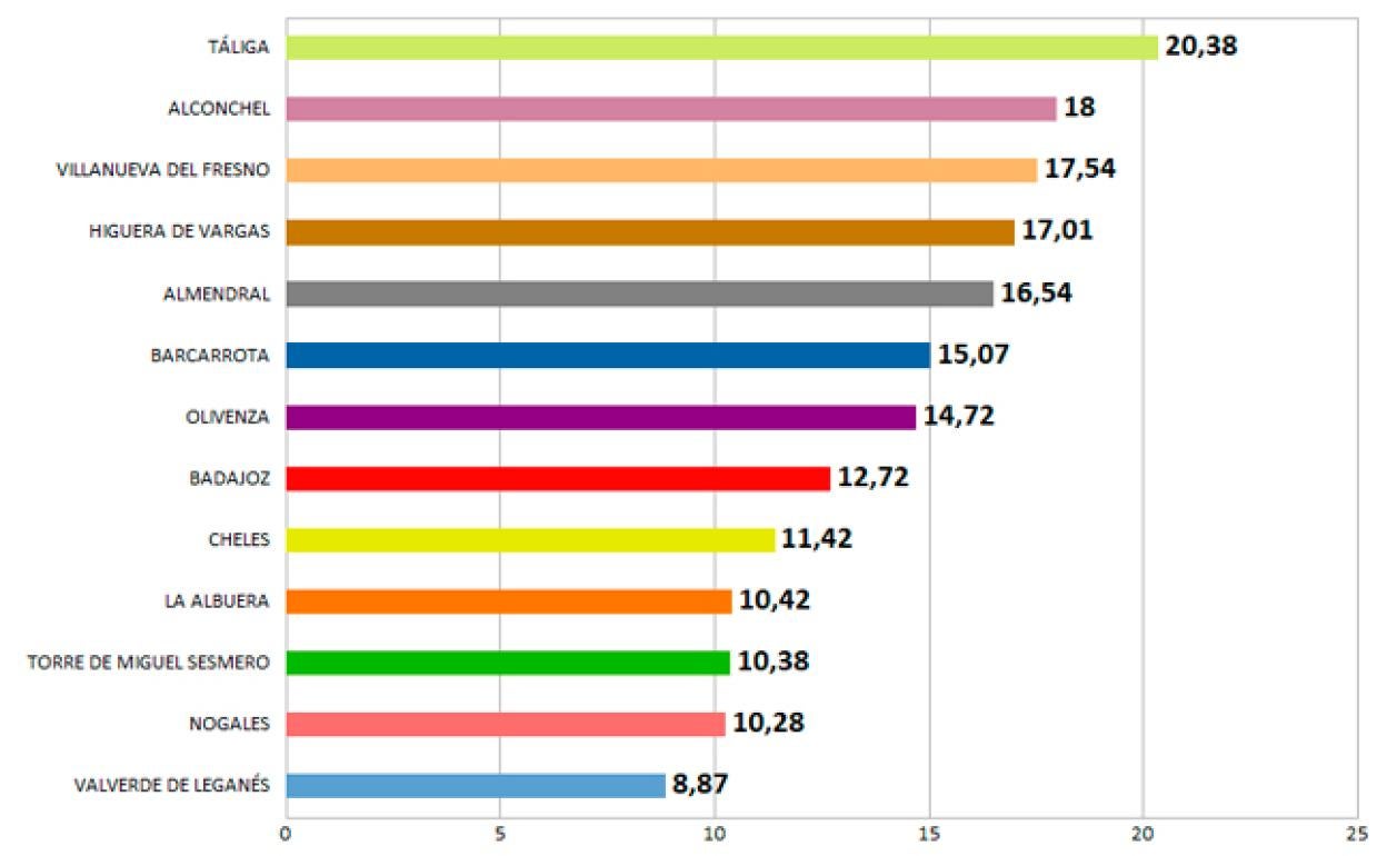 Por otro lado, Valverde es la localidad de los alrededores que menos paro tiene. Por detrás de Valverde están Nogales (44 parados y 10,28 de tasa), Torre de Miguel Sesmero (85 parados y 10,38 de tasa), La Albuera (133 parados y 10,42 de tasa), Cheles (85 parados y 11,42 de tasa), Badajoz (12.717 parados y 12,72 de tasa), Olivenza (1.154 parados y 14,72 de tasa), Barcarrota (335 parados y 15,07 de tasa), Almendral (132 parados y 16,54 de tasa), Higuera de Vargas (208 parados y 17,01 de tasa), Villanueva del Fresno (386 parados y 17,54 de tasa), Alconchel (194 parados y 18,00 de tasa), y Táliga (85 parados y 20,38 de tasa).