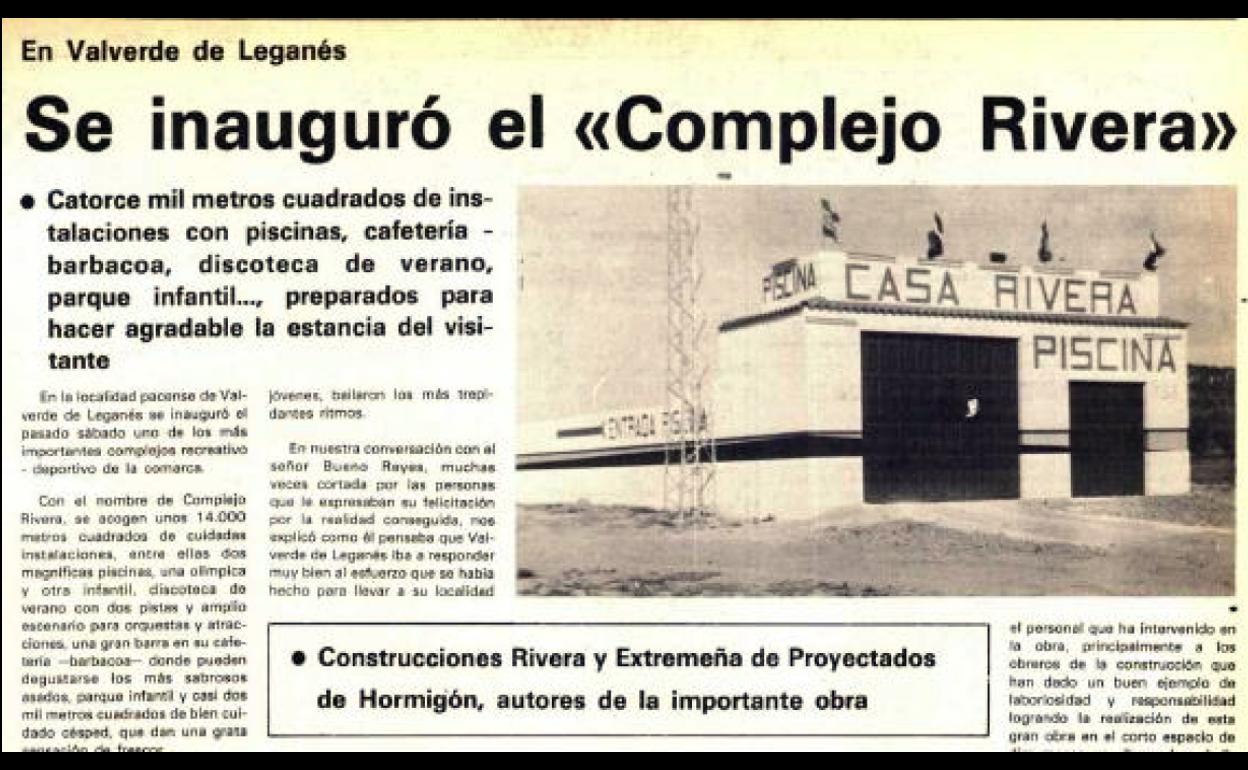 El 22 de mayo de 1982 tuvo lugar la apertura del Complejo Rivera, un espacio de 14.000 metros cuadrados que contaba con piscinas, cafetería – ... barbacoa, discoteca de verano, parque infantil, etc. Dicha construcción se debió a sus dos propietarios, Fernanda Reyes Rivera y Luis Bueno Reyes.