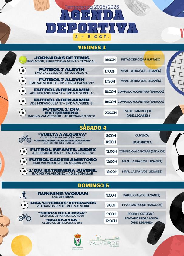 La agenda deportiva del fin de semana ordenada por día y hora es la siguiente: