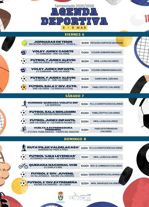 • Voleibol Judex Infantil: el EMD Valverde visita al CV Zurbarán, a las 18.30 horas en el Colegio Zurbarán de Badajoz.