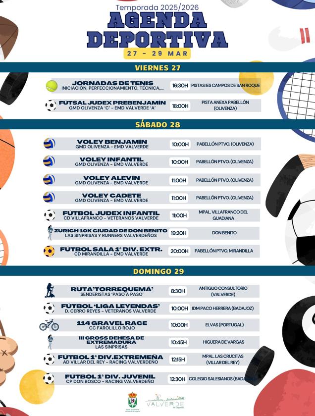 • Fútbol sala Judex Prebenjamín: el EMD Valverde visita al GMD Olivenza C, a las 18.00 horas en la pista anexa del pabellón de Olivenza.