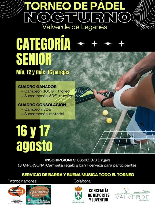 El grupo de Pádel, en colaboración con la Escuela Municipal de Deportes, ha organizado un torneo de pádel nocturno para la categoría senior, que tendrá lugar los días 16 y 17 de agosto. Cita muy esperada por los amantes a este deporte que sigue teniendo bastante afición entre el vecindario valverdeño y muchos visitantes que viajan hasta el municipio para usar las pistas.
