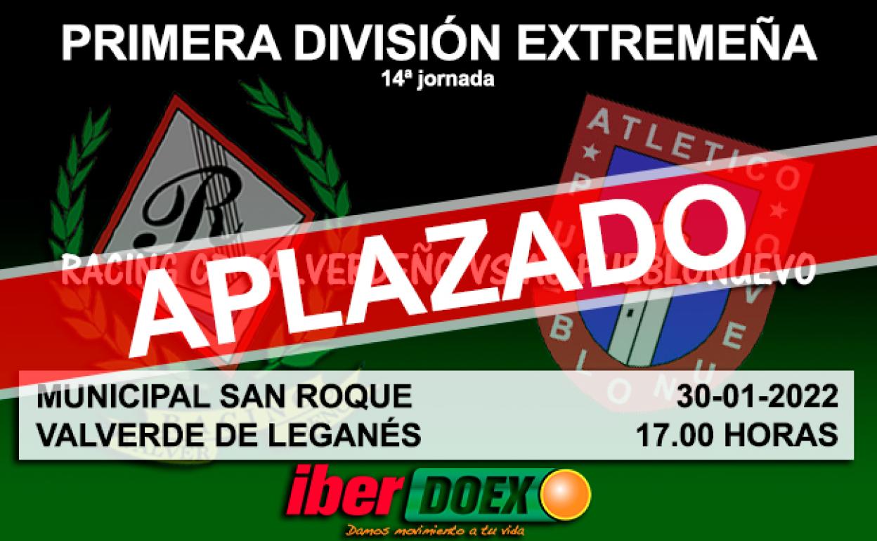 La Federación Extremeña de Fútbol ha informado que el encuentro de este domingo correspondiente a la 14ª jornada de la Primera División Extremeña, que enfrentaba al Racing Valverdeño y al Atlético Club Pueblonuevo, ha sido aplazado por varios contagios por coronavirus en el equipo pueblonuvense.