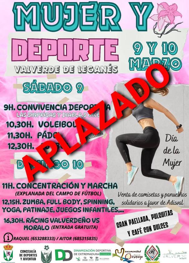 Las esperadas jornadas 'Mujer y Deporte' en Valverde de Leganés, programadas para este fin de semana, 9 y 10 de marzo, como parte de las ... actividades por el Día de la Mujer, han sido aplazadas debido a las condiciones climatológicas desfavorables.