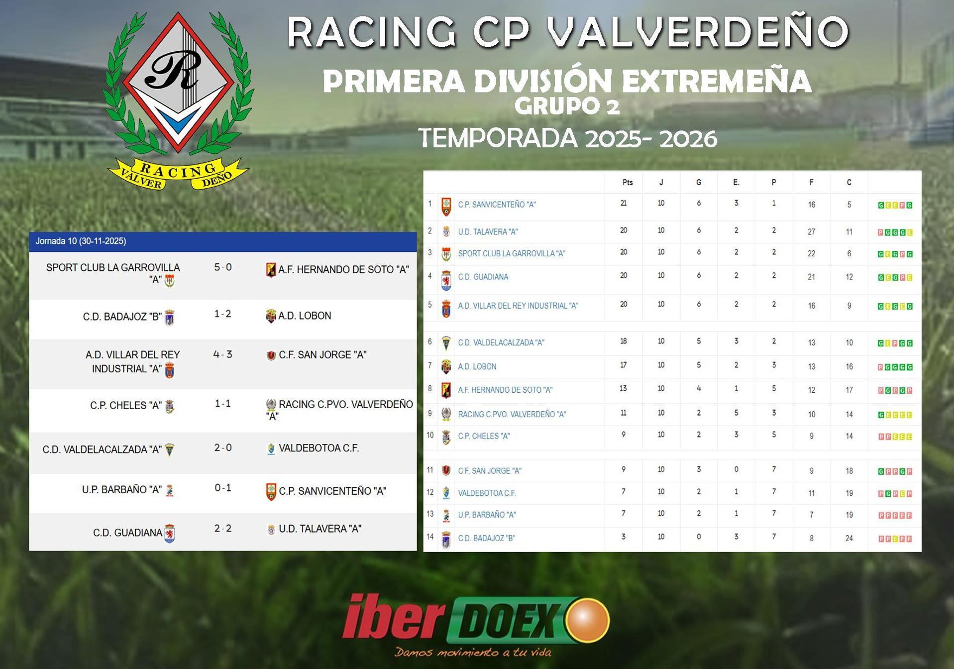 El próximo fin de semana no habrá jornada de liga. La competición regresará el 14 de diciembre, con el último partido de este 2025, en el que el Racing recibirá en casa al Valdelacalzada, sexto clasificado con 18 puntos. En cambio, este 5 de diciembre se jugarán los octavos de final de la Copa de Extremadura, en los que el Racing recibe al UD Talavera.