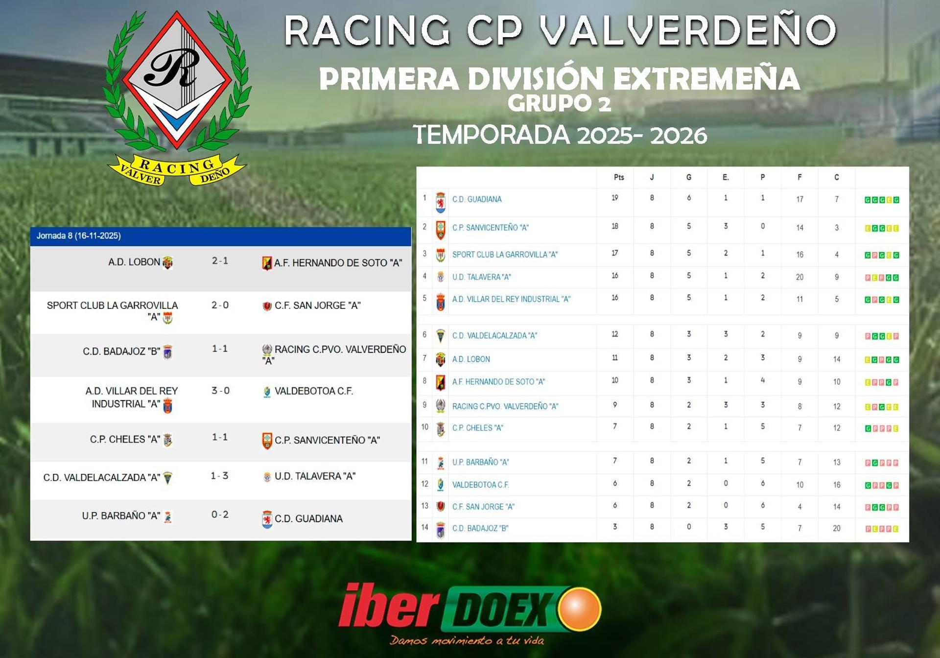 El pitido final certificó el reparto de puntos. El Badajoz sigue colista con 3 puntos mientras que el Racing mantiene su novena posición con 9 puntos. Este próximo fin de semana se disputa la novena jornada de liga con la visita del AD Villar del Rey a Valverde de Leganés. Marcha quinto con 16 puntos.