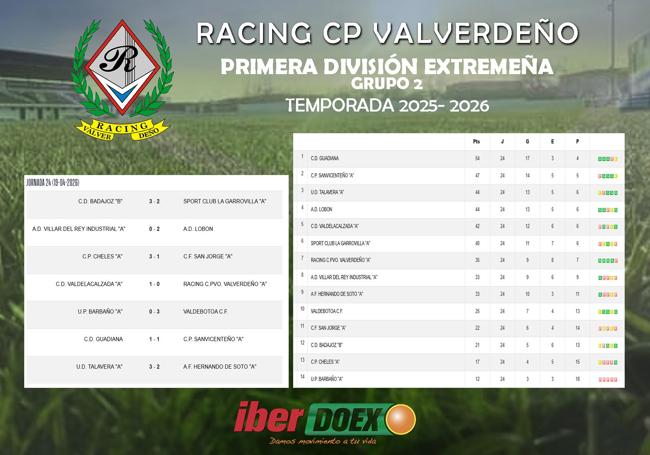 Racing CP Valverdeño no perdía un partido desde el 22 de febrero, contra el Hernando de Soto. Desde entonces, sumó 14 puntos de los 18 ... posibles, que le aseguraron la permanencia en la Primera División Extremeña una temporada más y, además, le mantuvo vivas las opciones de disputar el playoff de ascenso a Tercera División. Hasta la pasada jornada, en la que ha perdido en su visita a Valdelacalzada, esfumándose cualquier opción de acabar entre los cuatro primeros.