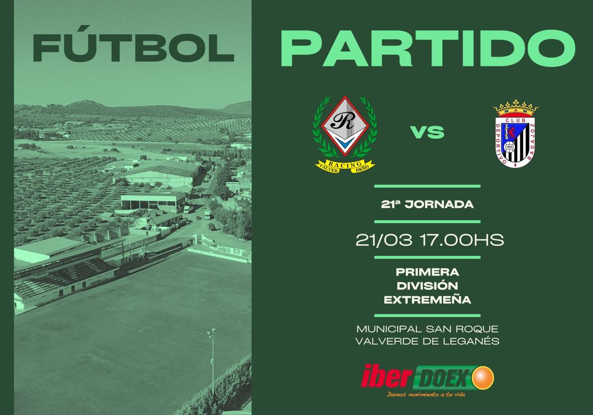 Racing CP Valverdeño y CD Badajoz B se ven las caras esta tarde en el encuentro de la vigesimoprimera jornada de liga que tendrá lugar ... en el Municipal de San Roque de Valverde de Leganés.