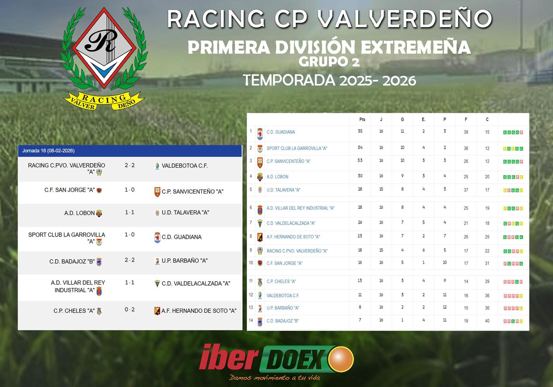 El empate mantiene al Racing en noveno lugar. El Hernando de Soto, octavo, se aleja 5 puntos de distancia, y por abajo, el San Jorge se ha acercado a los valverdeños, ahora están a solo 2 puntos. Eso sí, el equipo de Alejandro Durán tiene un encuentro menos que se disputará este jueves, también en Valverde, ante el UD Talevera. El fin de semana no habrá liga por la celebración del Carnaval. Regresará el domingo 22 con la visita de los valverdeños al Hernando de Soto, en Barcarrota.