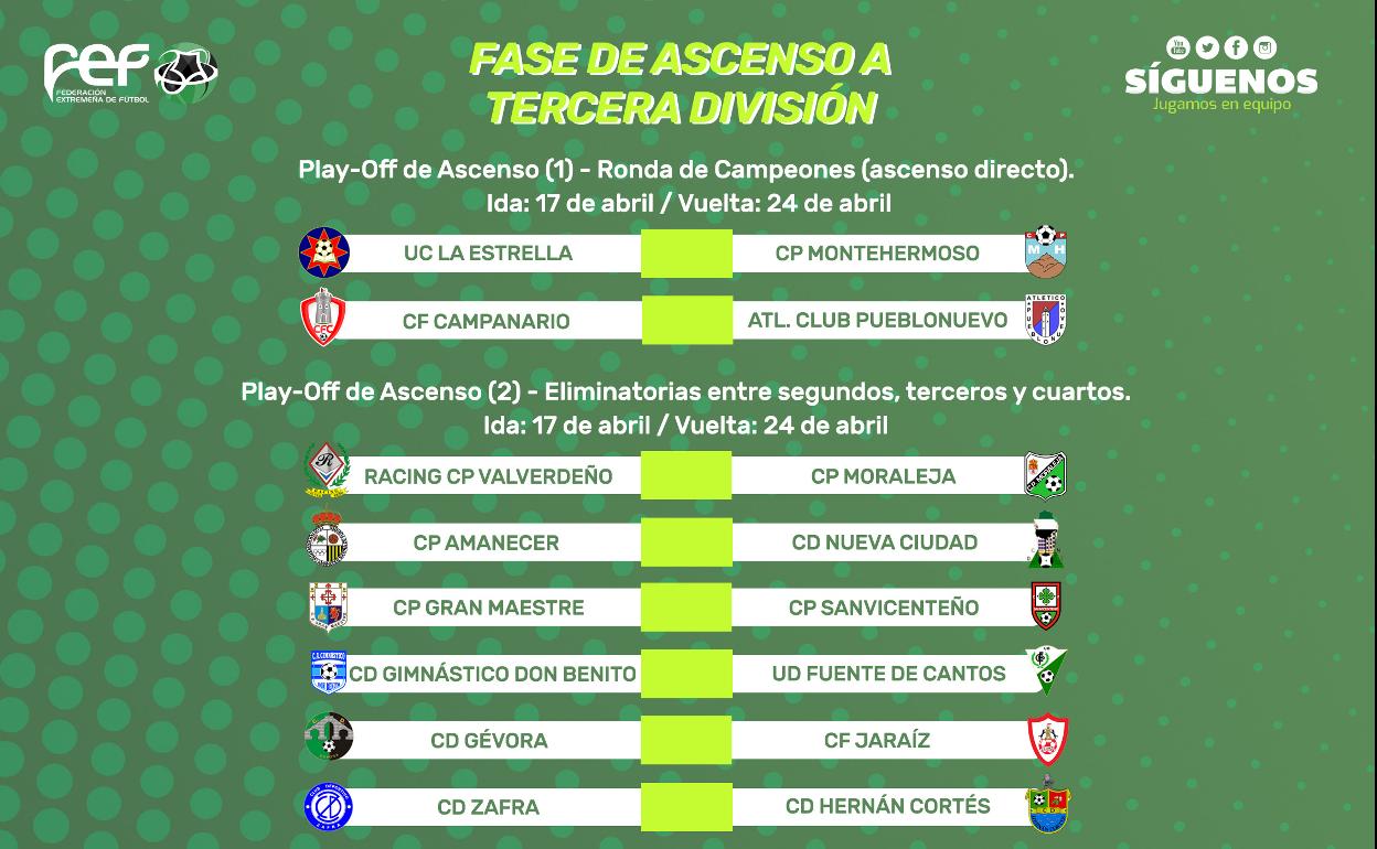 El playoff de ascenso directo ha deparado los siguientes emparejamientos: UC La Estrella contra CP Montehermoso y CF Campanario contra Pueblonuevo. En cuanto al playoff de asenso entre segundos, terceros y cuartos ha deparado los siguientes cruces: Racing Valverdeño contra CP Moraleja, CP Amanecer contra CD Nueva Ciudad, CP Gran Maestre contra CP Sanvicenteño, Gimnástico Don Benito contra UD Fuente de Cantos, CD Gévora contra CF Jaraíz y CD Zafra contra CD Hernán Cortés.