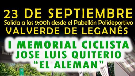La Peña Ciclista Farolillo Rojo ha publicado el cartel del I Memorial Ciclista José Luis Quiterio El Alemán que se celebrará en Valverde de Leganés ... el próximo 23 de septiembre. Dicha actividad se ha organizado en memoria del valverdeño que falleció el dos de septiembre de 2017 cuando practicaba uno de sus deportes favoritos, el ciclismo.