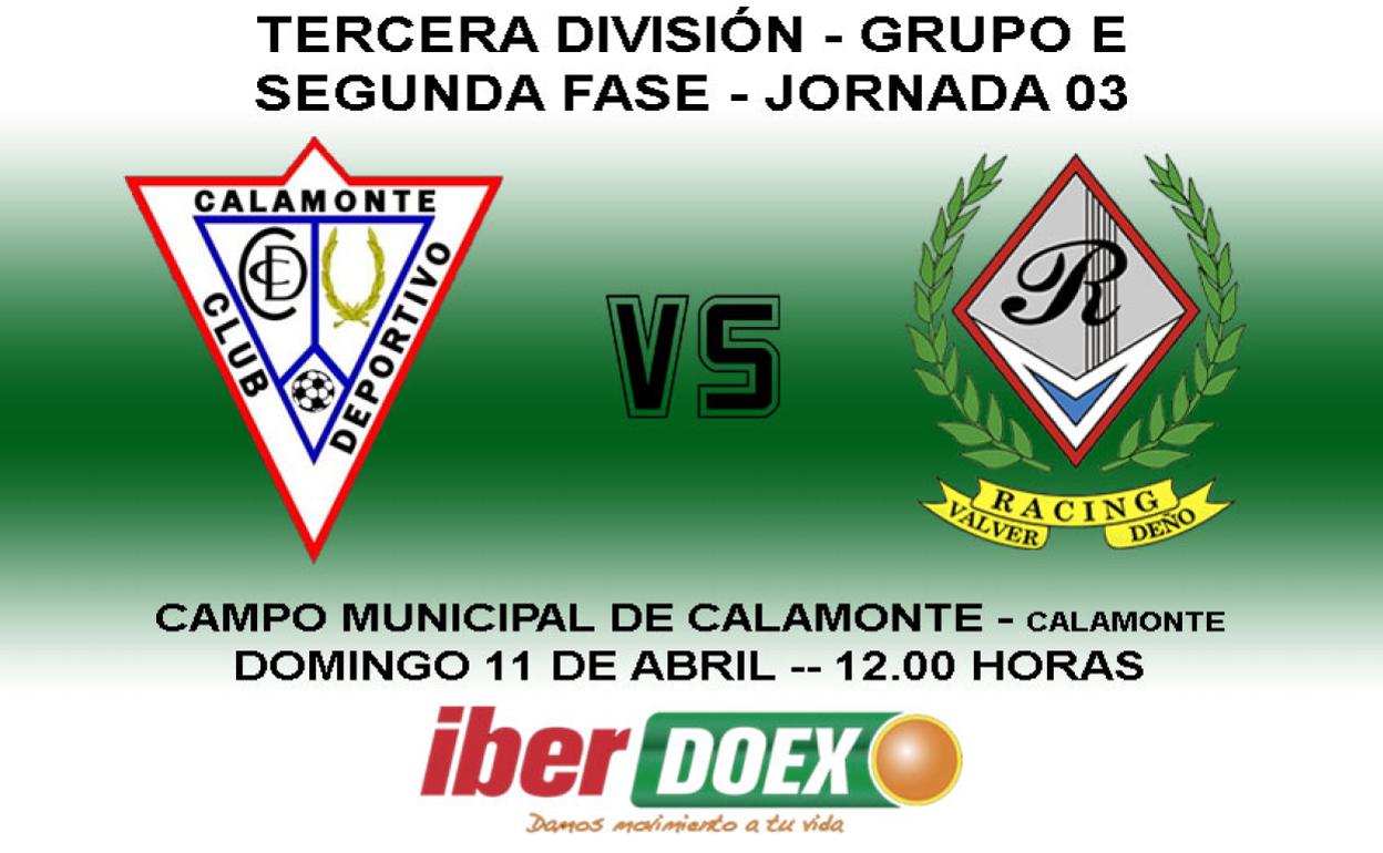 El nuevo Racing Valverdeño dirigido por Fernando Negrete y Juan Domínguez 'Pegote' se estrena este domingo 'con la más fea', con el líder del grupo, Calamonte. Difícil papeleta para los valverdeños que quieren dar la vuelta a la situación e intentar salir de los puestos de descenso.