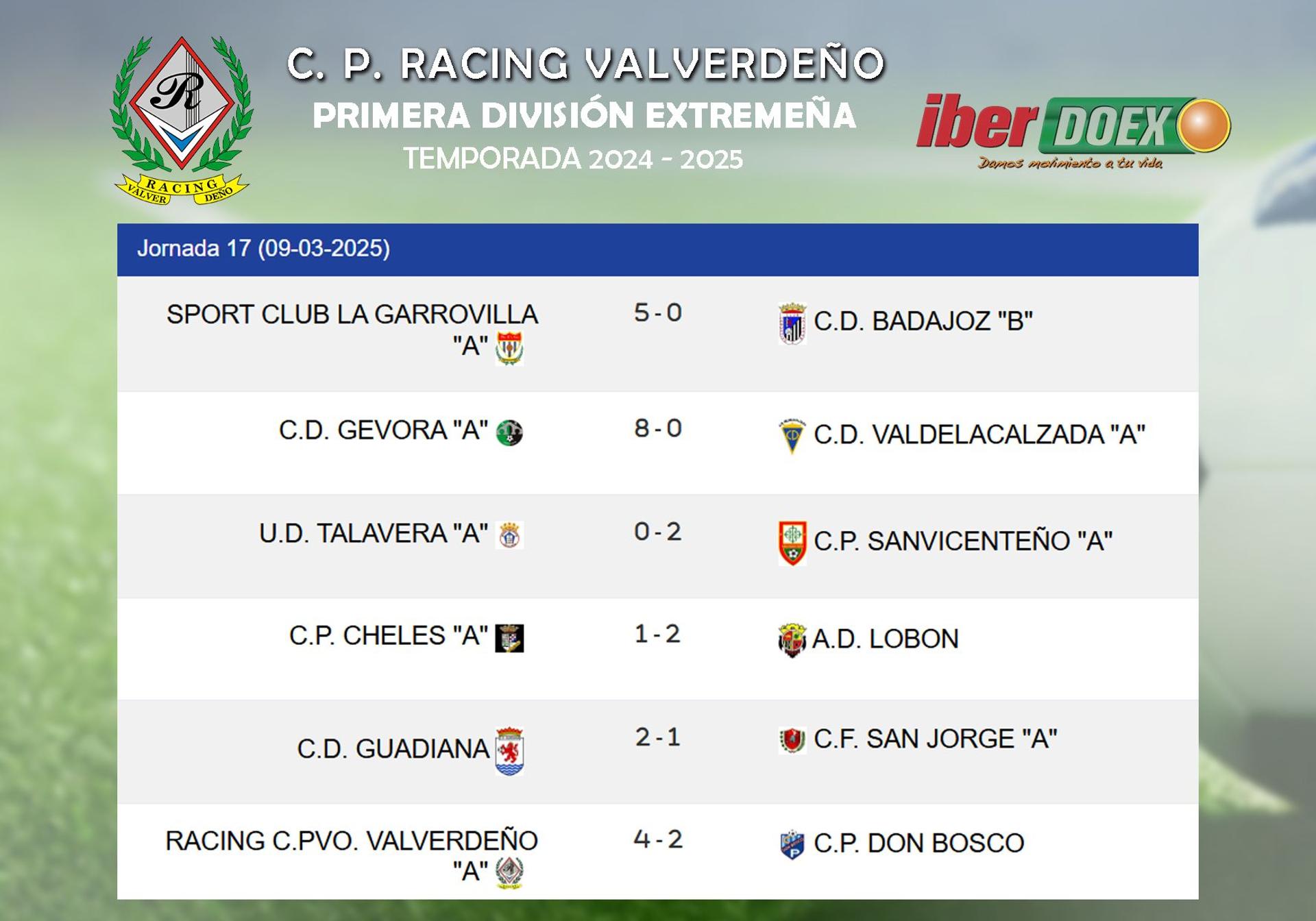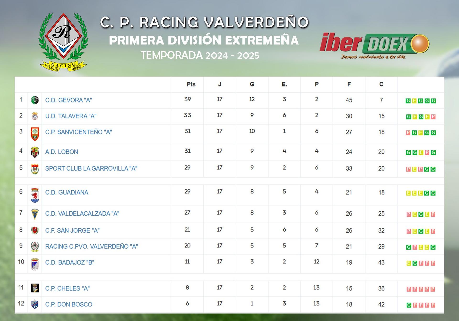 A falta de cinco jornadas para el final de la temporada regular, los valverdeños siguen novenos con 20 puntos. El próximo domingo vuelven a jugar en Valverde, frente el SC La Garrovilla, que tiene 29 puntos y esta jornada ha goleado al CD Badajoz por 5 – 0.