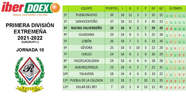 Ahora, tras esta 18ª jornada, tercero y cuarto son el Racing Valverdeño y el Guadiana, empatados a puntos. Estos cuatro equipos disputarían la liguilla de promoción a día de hoy, pero aún restan 12 puntos y puede pasar cualquier cosa.