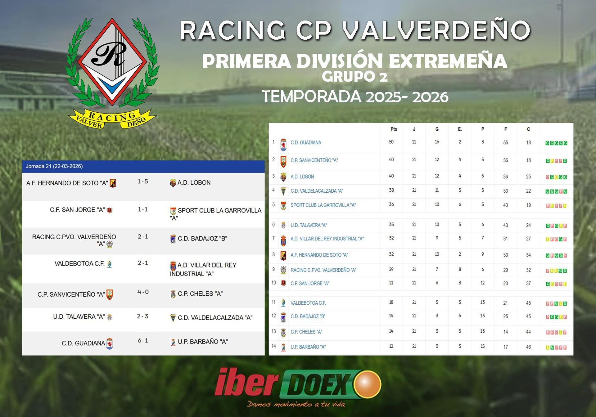 Los de Valverde mantienen el noveno puesto, con 29 puntos. A falta de 5 jornadas para el final de la liga, esta situación les hace estar prácticamente salvados. Este fin de semana visitan al AD Villar del Rey, al que podrían quitar la posición ya que es séptimo con 3 puntos más. En la ida empataron a 1.
