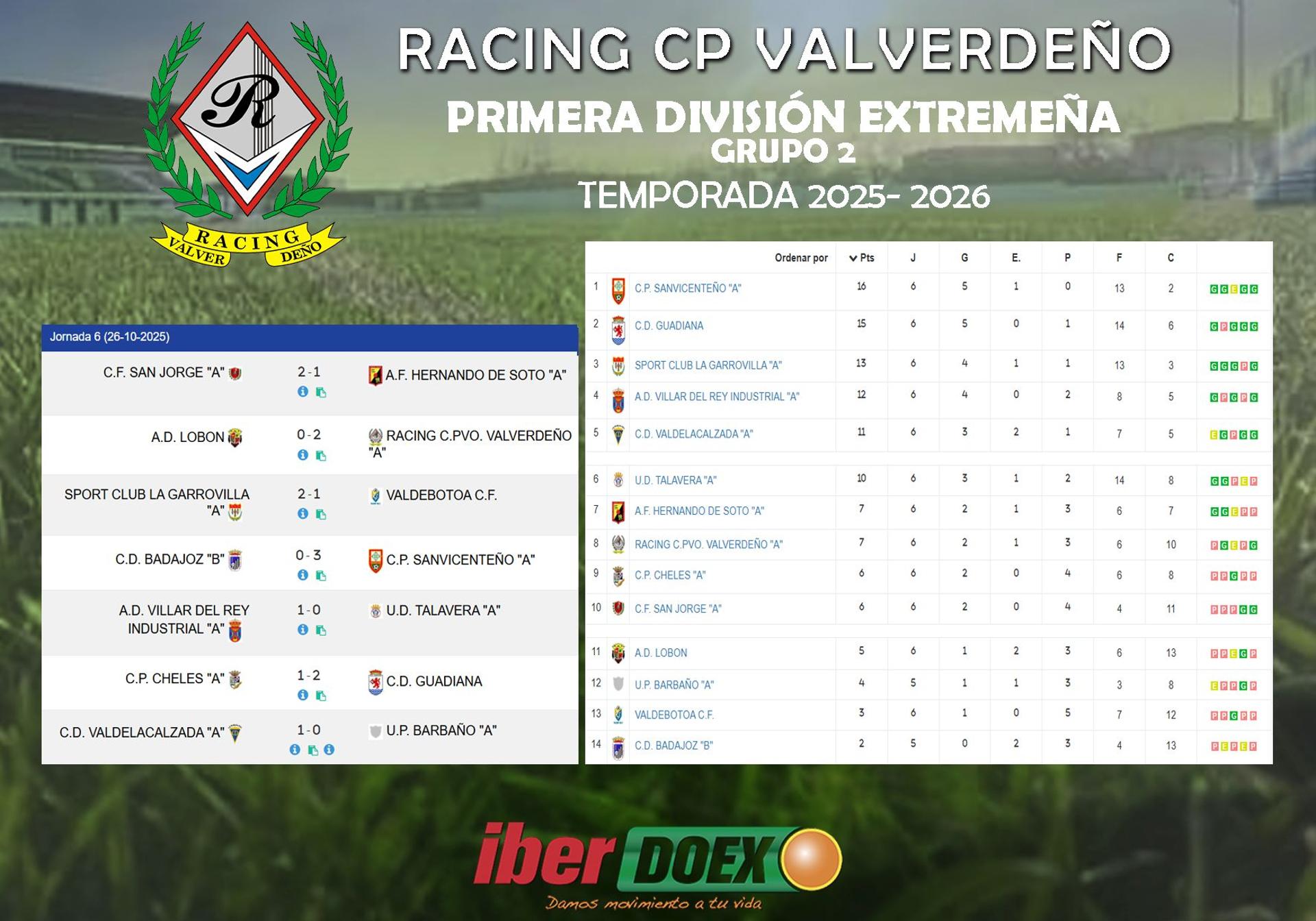 Con esta trabajada victoria, el Racing CP Valverdeño asciende hasta la octava posición, con 7 puntos, empatado con el AF Hernando de Soto. Este fin de semana no habrá jornada de liga, que regresará el 9 de noviembre con la visita del SC La Garrovilla —tercero con 13 puntos— al Municipal San Roque.