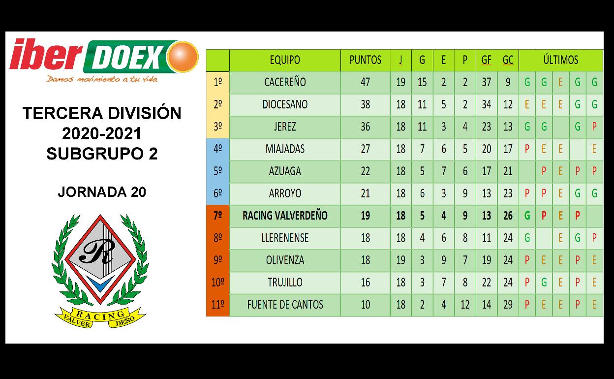 El Arroyo, con su victoria por 2-1 sobre el Llerenense en la última jornada de Tercera División disputada el fin de semana pasado, ha ... metido al Racing Valverdeño en los puestos de descenso. El equipo de Félix Pedro, que ha descansado, es séptimo, con 19 puntos, 2 menos que el Arroyo que marca la salvación.