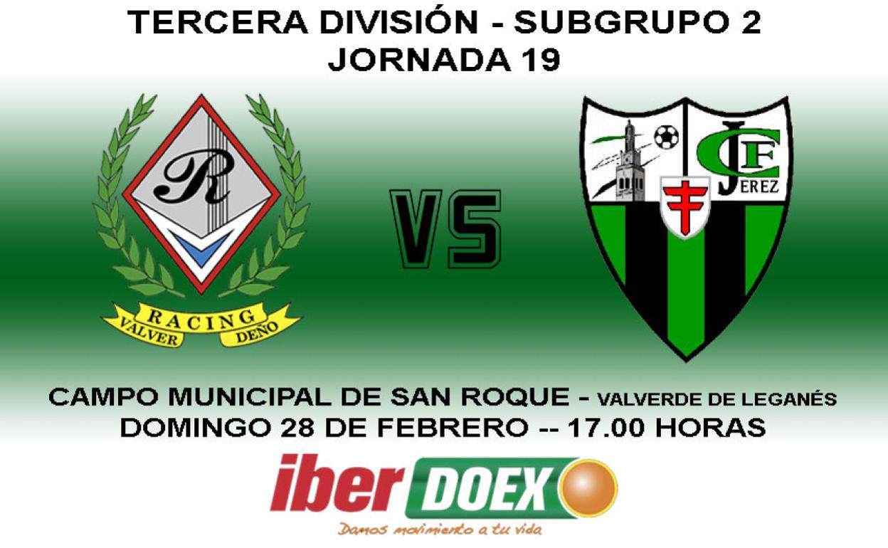 Tan solo tres días después de la victoria ante el Olivenza, el Racing Valverdeño recibe esta misma tarde al Jerez, el segundo clasificado del subgrupo ... 2 de la Tercera División. Con este encuentro, los hombres de Félix Pedro encaran el tramo más complicado de la liga en el que se enfrentan a los tres primeros; en primer lugar, al Jerez, después visitan al líder, el Cacereño; y por último reciben al Diocesano, tercero.