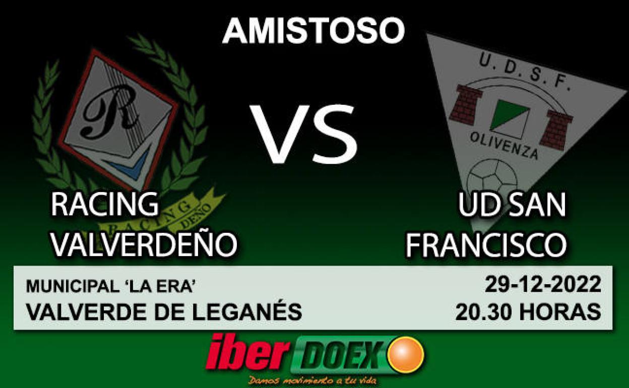 Este jueves, a las 20.30 horas, el Racing Valverdeño y el San Francisco se enfrentarán en un encuentro amistoso, el último del año, con el objetivo de no perder la forma física y mantener la regularidad durante el parón navideño.