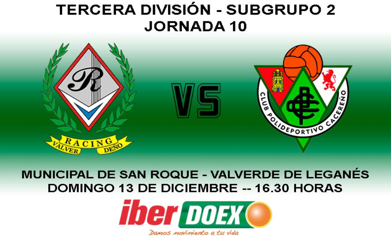 A falta de dos jornadas para el final de la primera vuelta, el Racing Valverdeño recibe al equipo que puede ser considerado como el más ... fuerte de la Tercera División, el Cacereño, un conjunto confeccionado para jugar en la Segunda División B.
