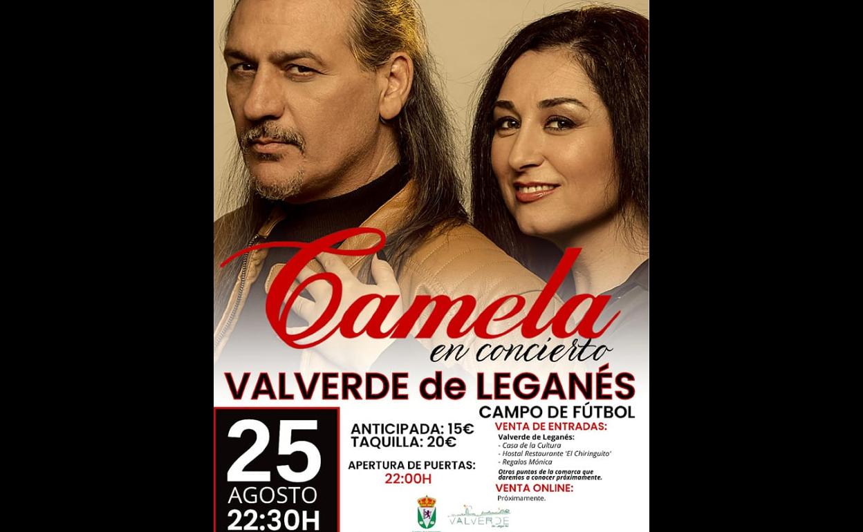 El próximo miércoles 6 de abril saldrán a la venta las entradas para el concierto que el grupo nacional Camela, formado por Dionisio y María ... de los Ángeles, ofrecerá en Valverde de Leganés durante las ferias y fiestas de agosto.