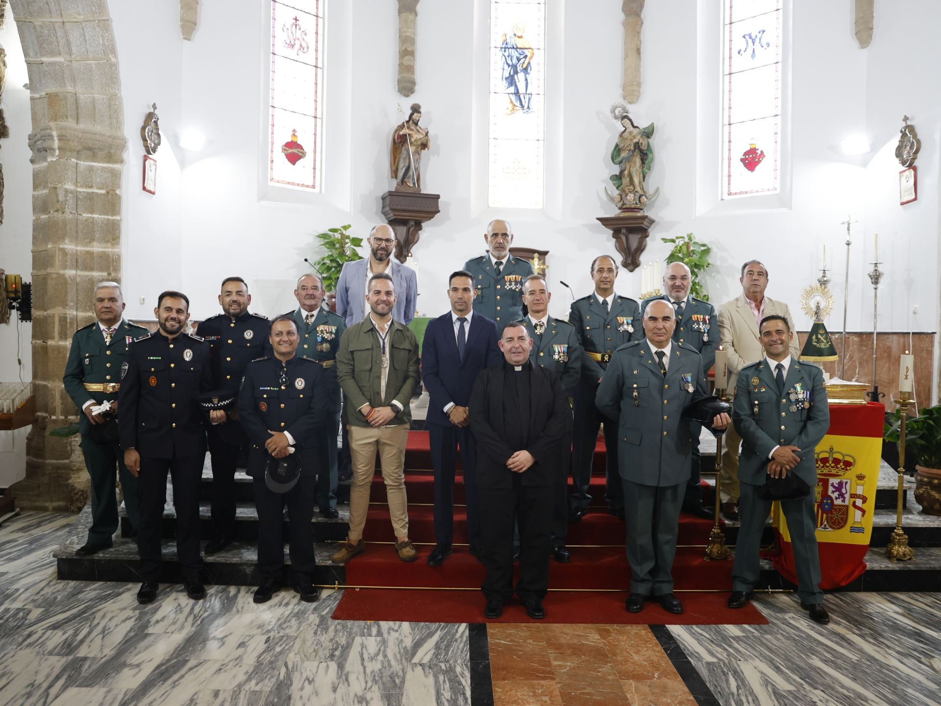 Al finalizar la eucaristía y tras las felicitaciones, los protagonistas se fotografiaron junto al párroco y a la Virgen del Pilar y el manto de la Guardia Civil, para inmortalizar el momento para el recuerdo.