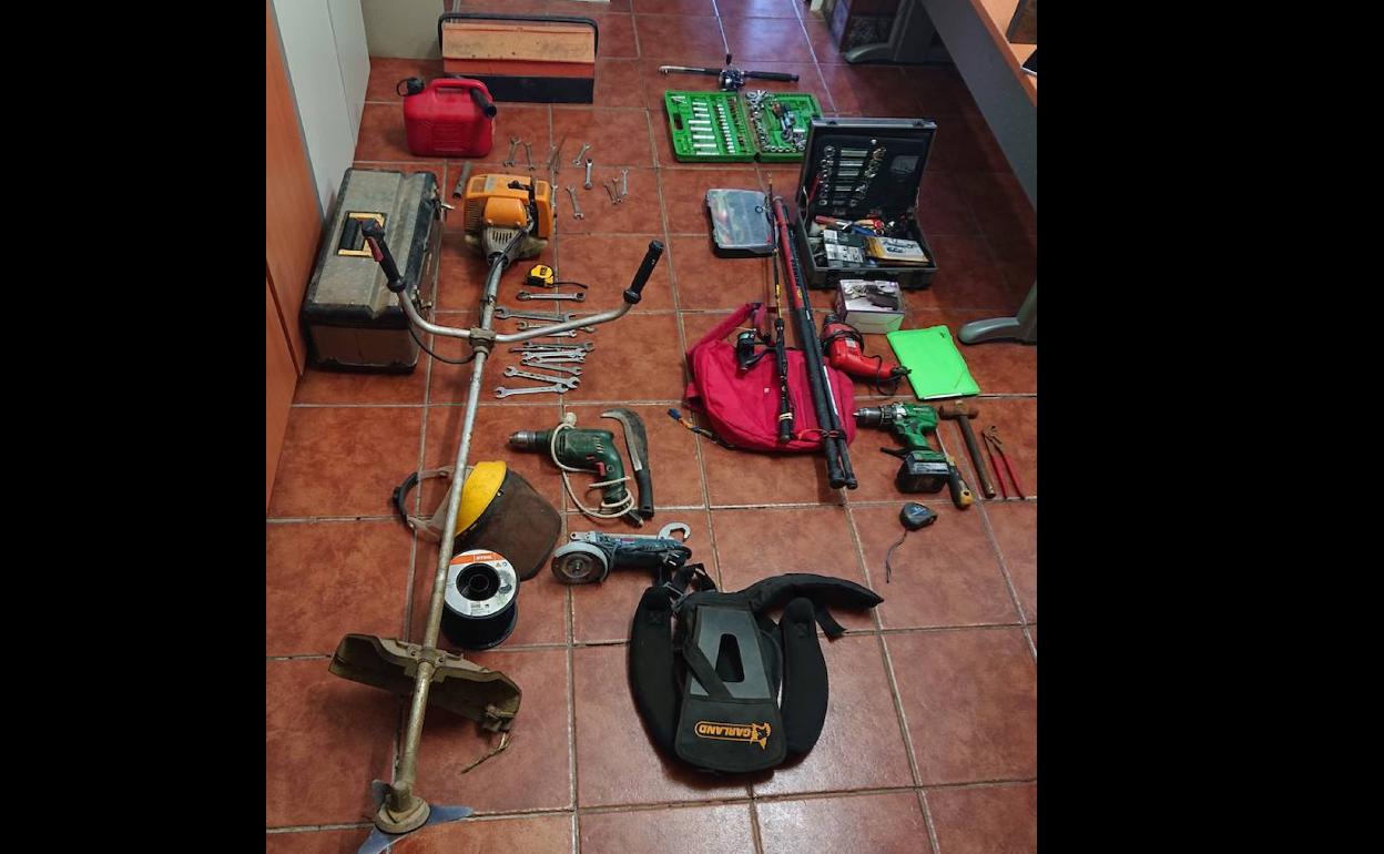 En sus actos sustrajo objetos como cajas de herramientas, una desbrozadora, una radial, un taladro, un arnés desbrozador, un teléfono móvil, un martillo, varias cañas de pescar, dos cañas de lanzado, un carrete de pesca, documentación personal, etc.