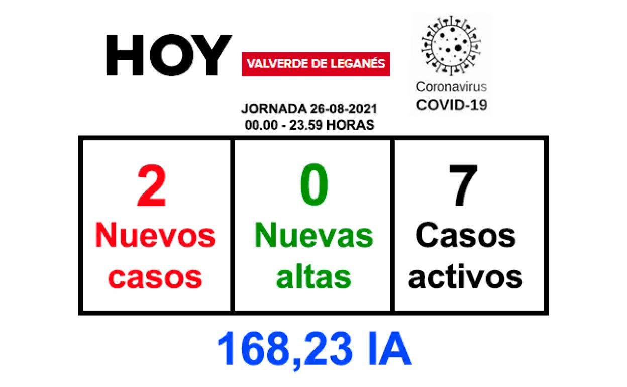 La jornada de este jueves 26 de agosto ha finalizado en Valverde de Leganés con 2 positivos y ningún recuperado. Por ello, el número de ... casos activos sube a 7 personas.