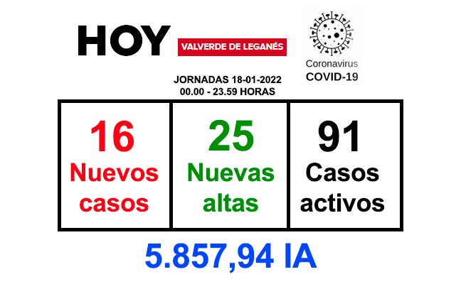 La jornada de este martes 18 de enero ha dejado 16 nuevos contagios en Valverde de Leganés. Por otro lado, se han notificado 25 recuperaciones. ... El número de casos activos baja hasta los 91.