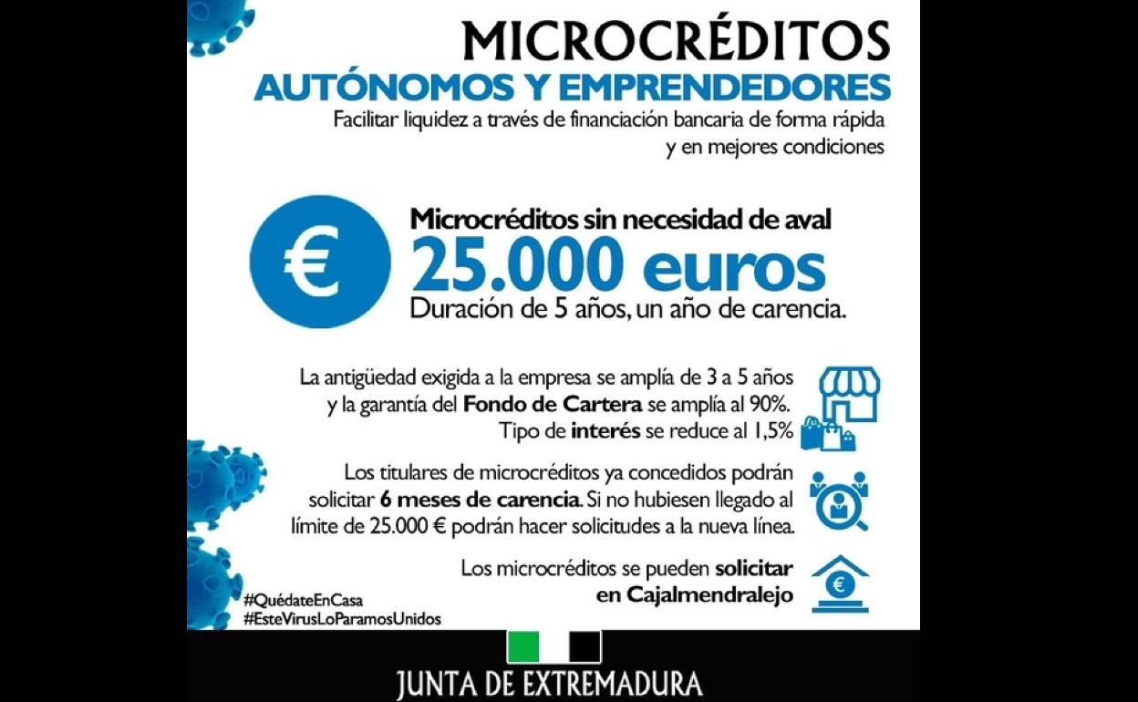La Junta de Extremadura pondrá en marcha una línea de microcréditos con el objetivo de facilitar liquidez a través de financiación bancaria de forma rápida ... y en mejores condiciones, dirigidas a emprendedores y autónomos frente a la situación actual producida por el COVID-19.