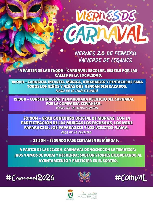Una semana después de su celebración oficial, Valverde de Leganés acoge el esperado Carnaval 2026, con la esperanza de vivir un intenso fin de semana de música, color y mucho ambiente. El motivo principal del cambio del fin de semana de su celebración ha sido intentar fomentar la participación ciudadana en la fiesta valverdeña y evitar que el Carnaval de Badajoz perjudique a la asistencia.