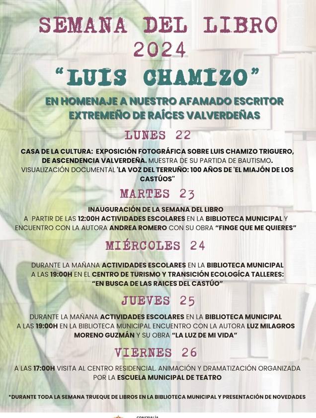 Desde el próximo 22 hasta el 26 de abril, Valverde de Leganés acoge la celebración de la Semana del Libro, una iniciativa organizada por la Concejalía de Cultura en colaboración con la Casa de la Cultura y la biblioteca municipal. Este año, las actividades buscan homenajear al afamado escritor Luis Chamizo, con raíces valverdeñas.