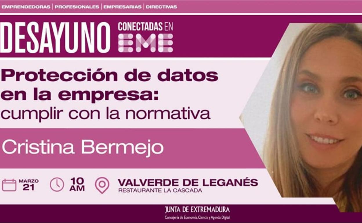 La encargada de la charla será Cristina Bermejo Galván, y en ella se abordarán normas obligatorias para cumplir en materia de Protección de Datos, conceptos básicos, qué implica su cumplimiento en las empresas o cómo influye en caso de tener comercio electrónico.