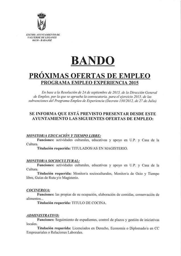 El Ayuntamiento de Valverde de Leganés publicó el pasado 16 de octubre un bando que informa a todos los valverdeños sobre próximas ofertas de empleo pertenecientes al Programa de Empleo Experiencia 2015.