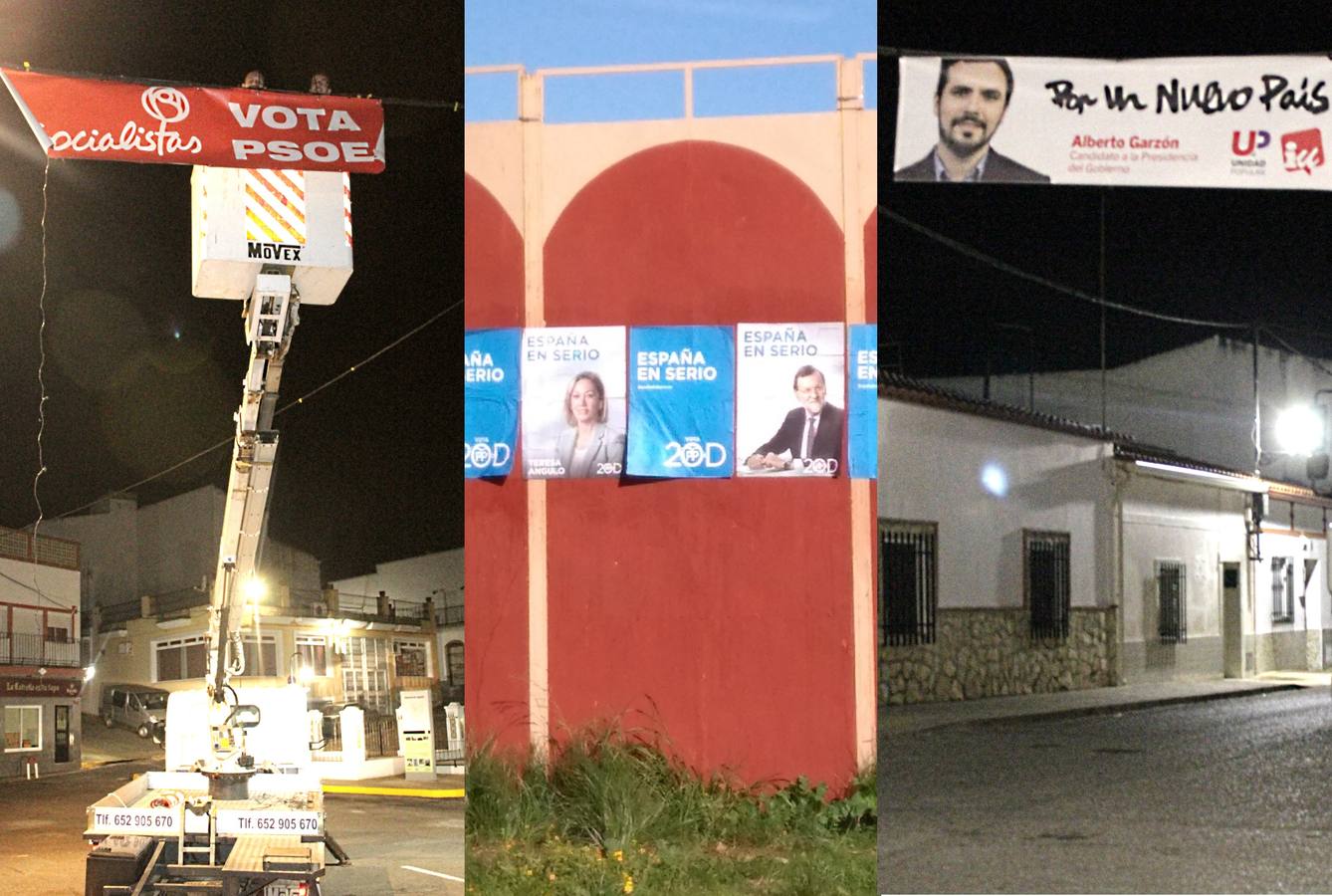 Anoche, a partir de la medianoche, comenzó la campaña electoral de las elecciones generales del próximo día 20 de diciembre. Como ya es tradicional, la compaña dio comienzo con la tradicional pegada de carteles por parte de los distintos partidos políticos y en nuestra localidad fueron los afiliados y simpatizantes del partido socialista, partido popular y de izquierda unida los que dieron el pistolazo de salida colocando sus respectivas propagandas y pancartas en los lugares habituales, pidiendo el voto para sus respectivos candidatos a la presidencia del Gobierno de España, Pedro Sánchez por parte del PSOE, Mariano Rajoy por el PP y Alberto Garzón por IU - Unidad Popular.