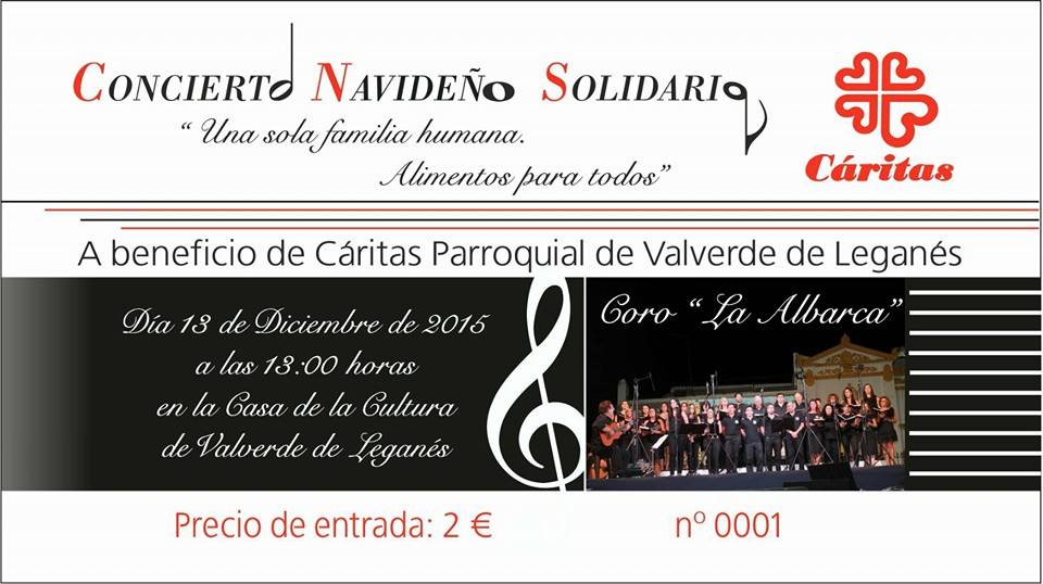 Este domingo 13 de diciembre, en la Casa de la Cultura, tendrá lugar un concierto navideño solidario, a beneficio de Cáritas Parroquial de Valverde de Leganés. Dicho concierto se celebra bajo el lema Una sola familia humana. Alimentos para todos. El grupo encargado de ofrecer dicho concierto será el coro La Albarca, proveniente de la localidad vecina de Barcarrota.