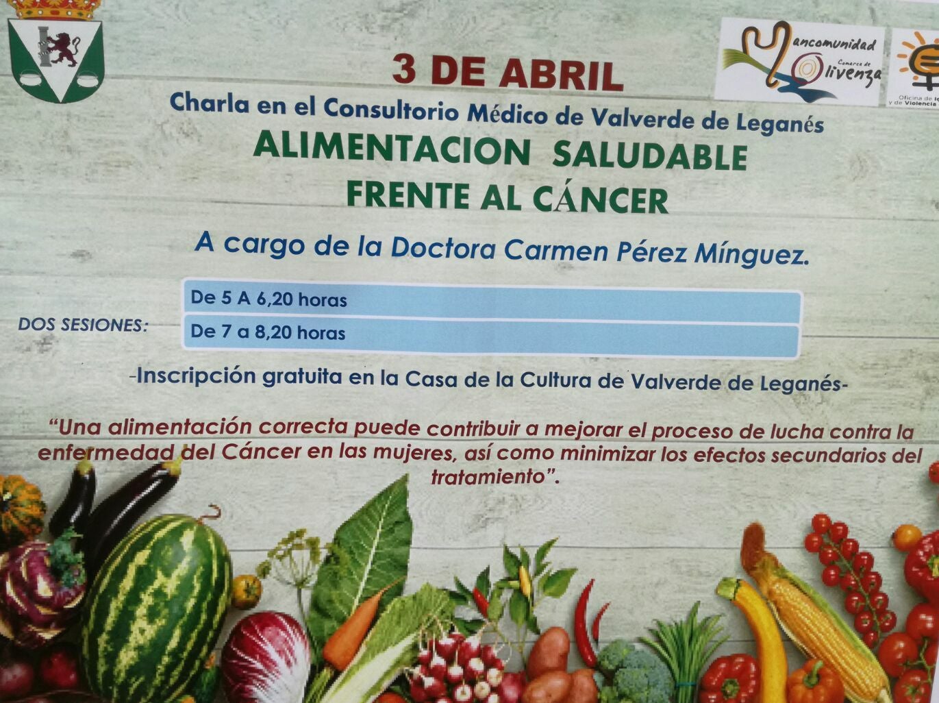 El próximo lunes, tres de abril, el consultorio médico de Valverde de Leganés acogerá una charla saludable a cargo de la doctora Carmen Pérez Mínguez. La inscripción es gratuita por lo que todos aquellos interesados en asistir deben comunicarlo a la Casa de la Cultura, centro médico o a la Concejala Gracia Sánchez previamente.