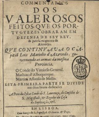 La información de este artículo es la traducción que realicé de los Comentarios de los Valerosos Hechos que los Portugueses realizaron en defensa de su Rey y Patria en la guerra del Alentejo que continuaba el Capitán Luis Marinho de Azevedo, gobernando las armas de la misma provincia. El Conde General de Vimioso. Mathias de Alburquerque. Martim Afonso de Mello, texto que igual que la carta ya publicada se encuentra en la Biblioteca Nacional de Portugal y está fechado en Lisboa en 1644.