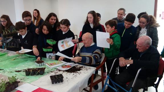 El Huerto en Familia está realizándose en este mes de marzo con dos visitas semanales al Centro de Día por parte de alumnos del Colegio Cristo Crucificado y del César Hurtado Delicado. Los escolares visitan a los mayores usuarios del centro acompañados de maestros con los que han preparado una serie de preguntas sobre las tareas que conlleva el cultivo de un huerto y para conocer como era el modo de vida cuando ellos eran jóvenes, también los acompañan algunos de sus abuelos que voluntariamente forman parte de la actividad. En cada uno de los colegios la organización de las visitas corre a cargo de Elena Parral en el centro público y de Pura Verdasco en el concertado.