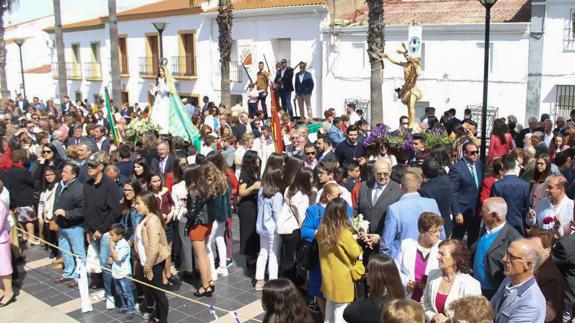 Con la llegada de las imágenes a la plaza se recrudecen los disparos y los dos abanderados que llevan las banderas de España y Extremadura, comienzan su acto, recorriendo el pasillo central, ondeando las enseñas con habilidad para no golpear a nadie con los mástiles, hasta encontrarse en el centro de la plaza donde bajo el sonido de los disparos y un fuerte aplauso, se abrazan y saludan.