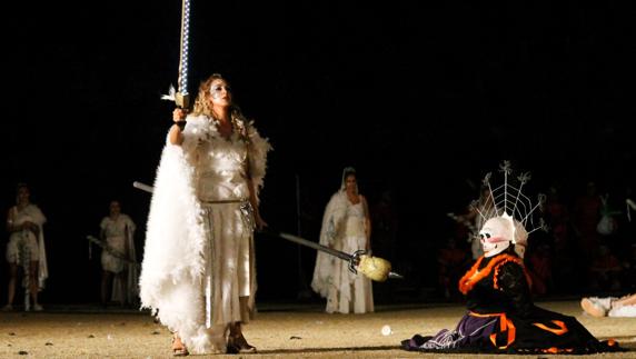 La escena comenzó con los bailes de un grupo de pequeños de Gimnasia Rítmica, a los que le siguió la escenificación de una fiesta y alegría por parte de Los Coros y Danzas de Valverde que se vería interrumpida por el pregón que anunció lo que estaba a punto de suceder. En ese momento y bajo un gran espectáculo de luz y sonido, entra en escena la protagonista de la noche, la Diabla, acompañada por su inmenso ejército.