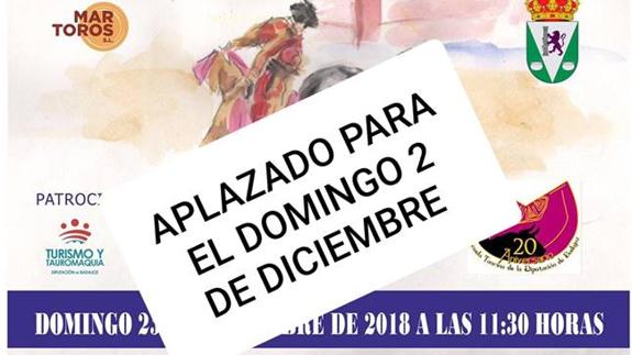 El mal estado del terreno y la previsión de lluvia, ha obligado a aplazar el espectáculo taurino, que se celebrará el próximo domingo, dos de diciembre.